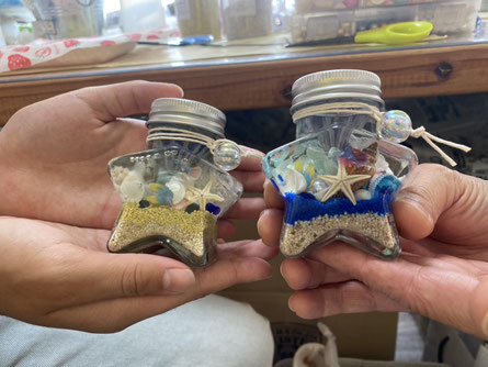 親子で海のクラフト教室での 星のハーバリウム作りです。 星型が可愛い瓶の中に 海の中のように 砂や貝やヒトデ、お魚も泳いている アクアハーバリウムです♪ 砂のカラーを自分のの好きな色にしたり オリジナル作品になっています