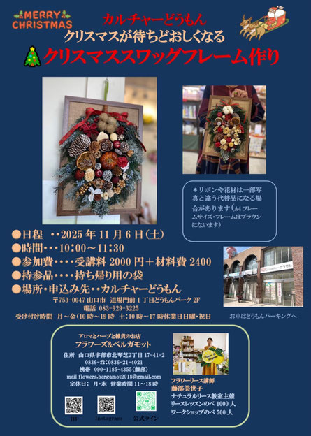 今回はクリスマスの壁飾りに「クリスマスススワッグフレーム作り」をします。