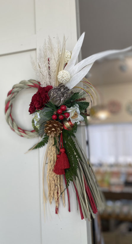 赤の混じったしめ縄に深紅のダリア、赤のタッセル、強さや情熱を表現しています。